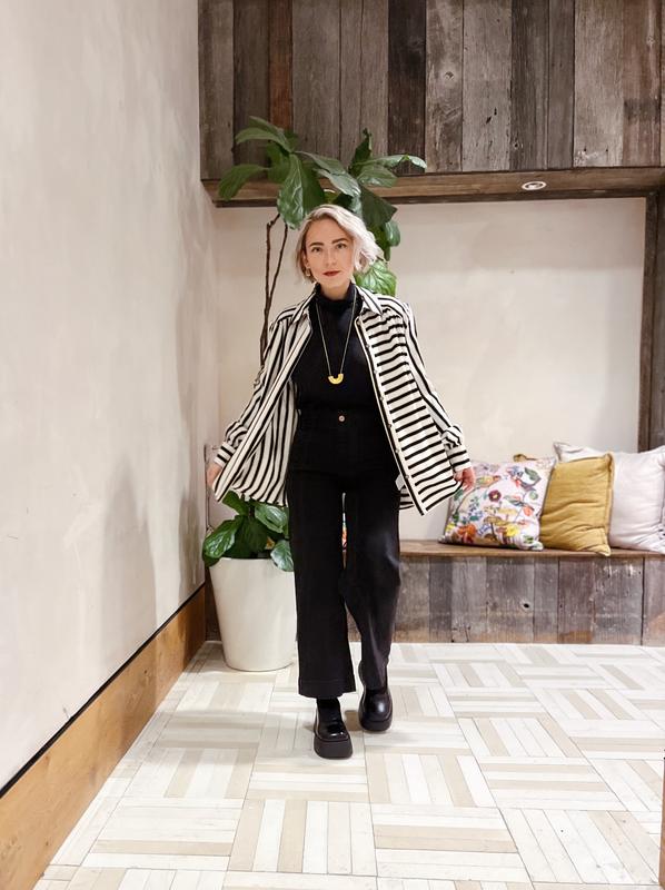 A striped button-up shirt is a workwear classic, but this one from Anthropologie puts a fun spin on it. Rather than starched cotton, we’ve got a silky viscose fabric, and instead of a blue-and-white banker stripe, we have a mix of horizontal and vertical black stripes.
